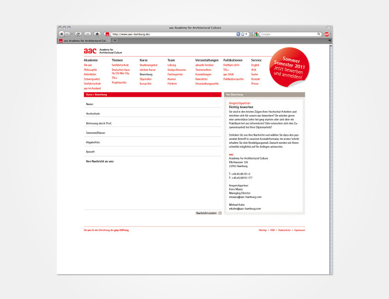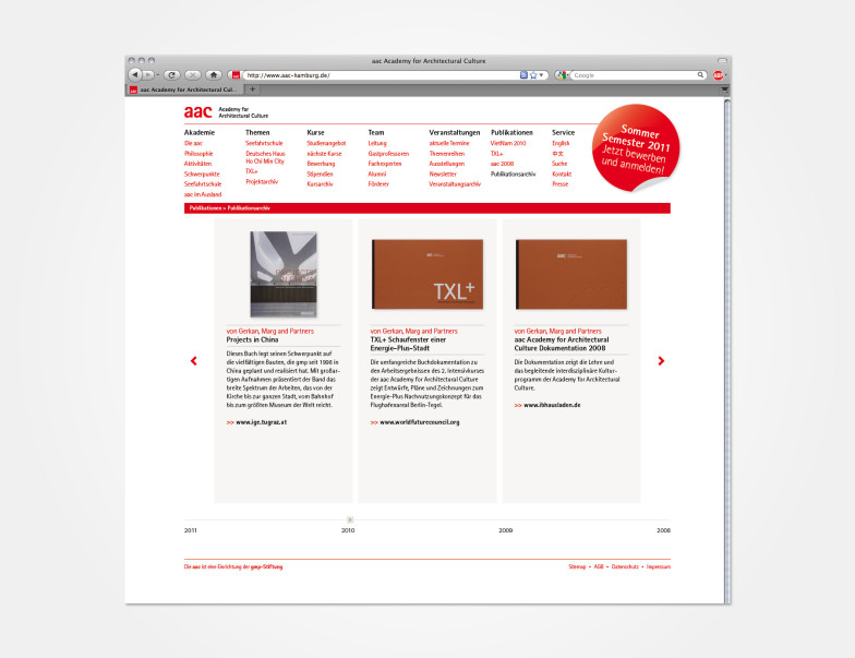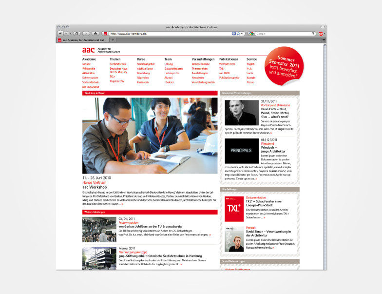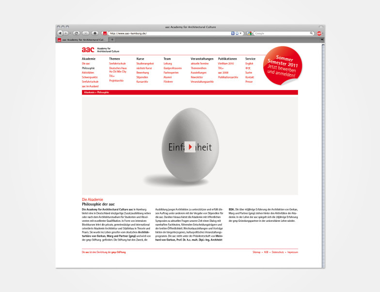 Relaunch of the aac website. The Academy for Architectural Culture (aac) is a private charitable organisation founded by the architects von Gerkan, Marg und Partner (gmp). It is sponsored by the gmp Foundation, established in 2007, for the purpose of supporting the education of young architects.