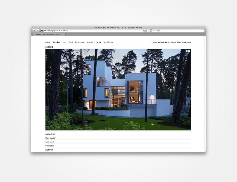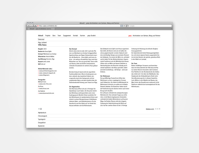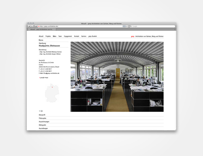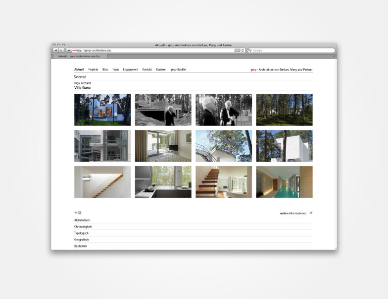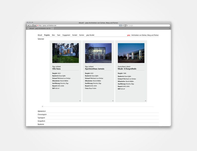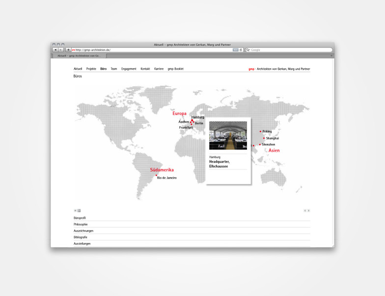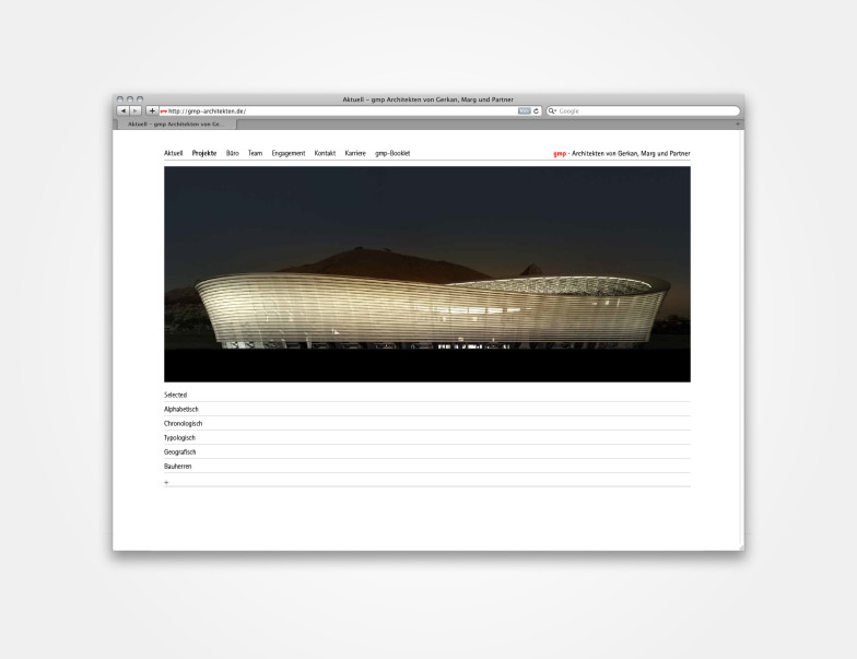 This is not only a relaunch … together with gmp I developed the new website of the Hamburg architects whose projects and offices are spread all around the world. The technical implementation was Visionate. Special features are: Webfont Rotis and a personalized PDF-booklet can be created for download.